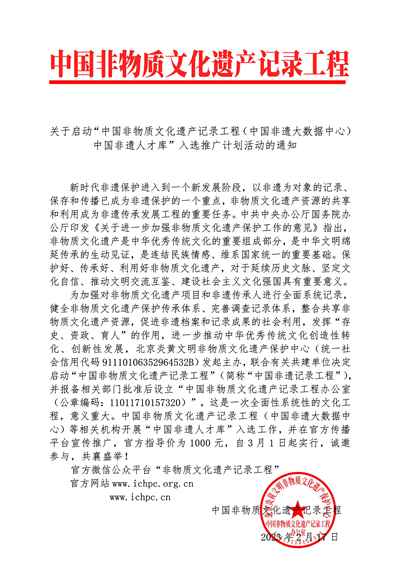 为加强对非物质文化遗产项目和非遗传承人进行全面系统记录,健全非物质文化遗产保护传承体系、完善调查记录体系,整合共享非物质文化遗产资源,促进非遗档案和记录成果的社会利用,发挥“存史、资政、育人”的作用,进一步推动中华优秀传统文化创造性转化、创新性发展,北京炎黄文明非物质文化遗产保护中心(统一社会信用代码91110106352964532B)发起主办,联合有关共建单位决定启动“中国非物质文化遗产记录工程”(简称“中国非遗记录工程”),并报备相关部门批准后设立“中国非物质文化遗产记录工程办公室(公章编码:11011710157320)”,这是一次全面性系统性的文化工程,意义重大。中国非物质文化遗产记录工程(中国非遗大数据中心)等相关机构开展“中国非遗人才库”入选工作,并在官方传播平台宣传推广,诚邀参与,共襄盛举!